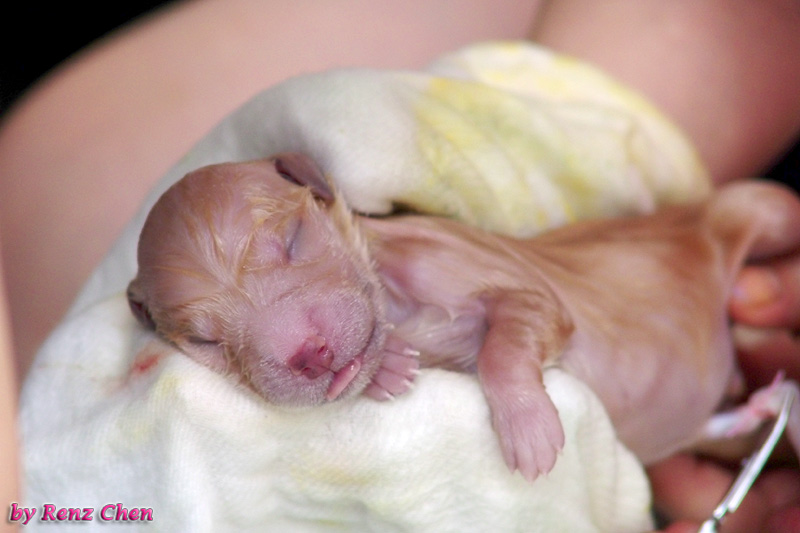 波爸、波媽幫忙給小狗臍帶綁上棉線...